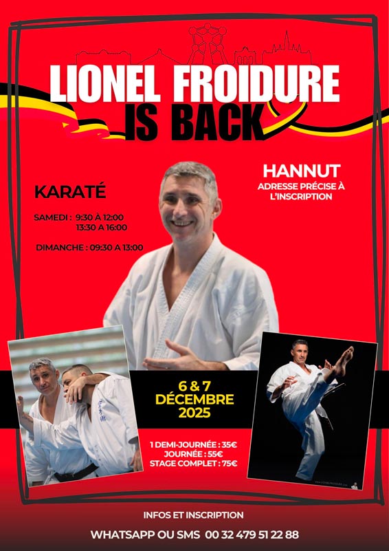 En décembre, j’aurai le plaisir de revenir en stage karaté en Belgique à Hannut, à l’ouest de Liège. Un grand merci à Vincent Bourguignon pour sa confiance renouvellée.